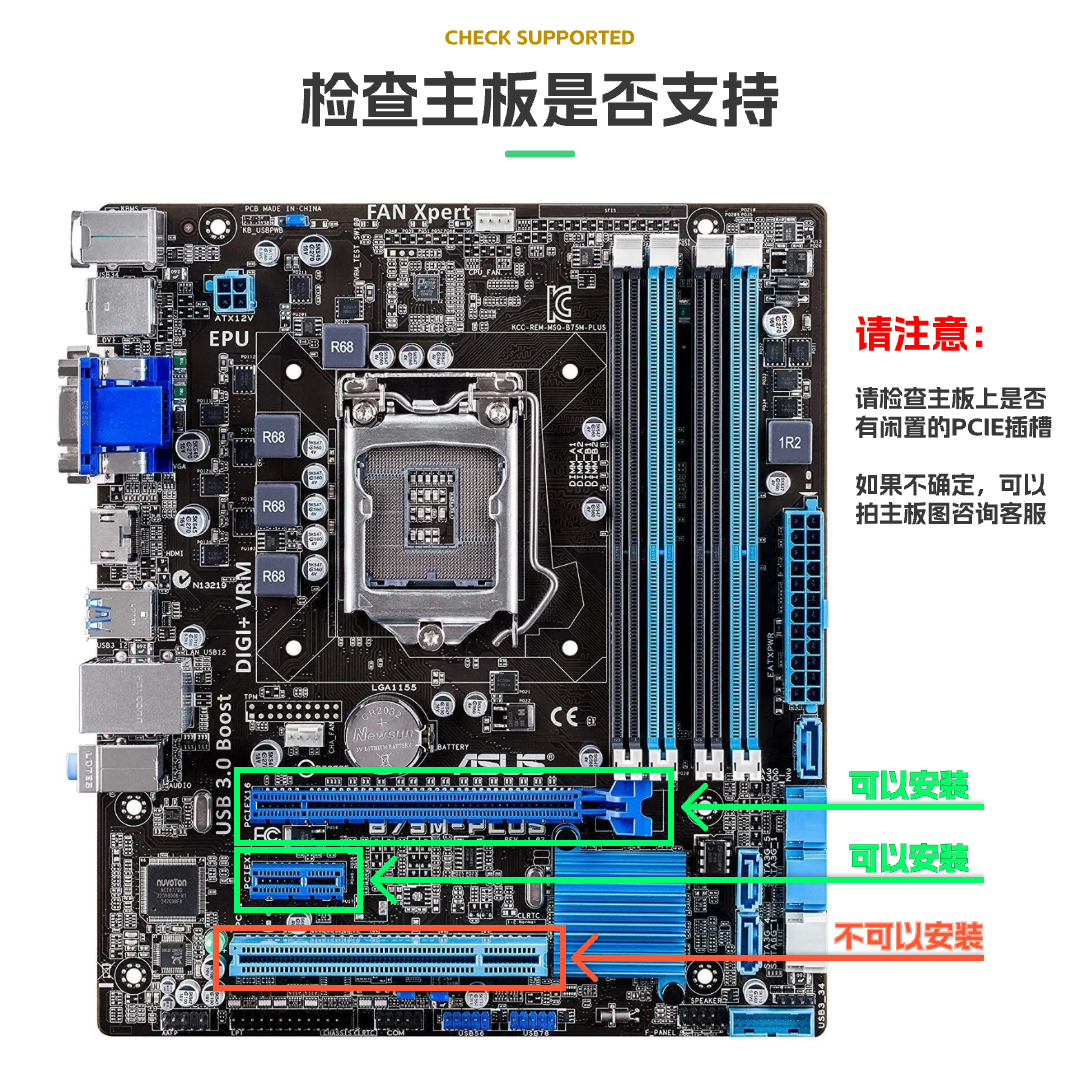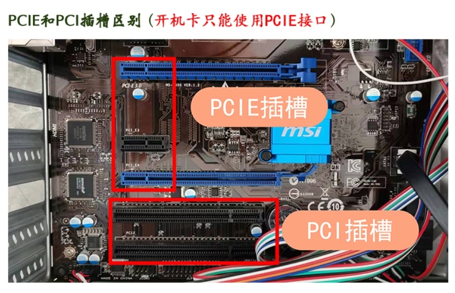 本开机卡只能使用在含有PCIE x1 x4 x16的插槽上,不能使用在PCI插槽,如下图所示的接口