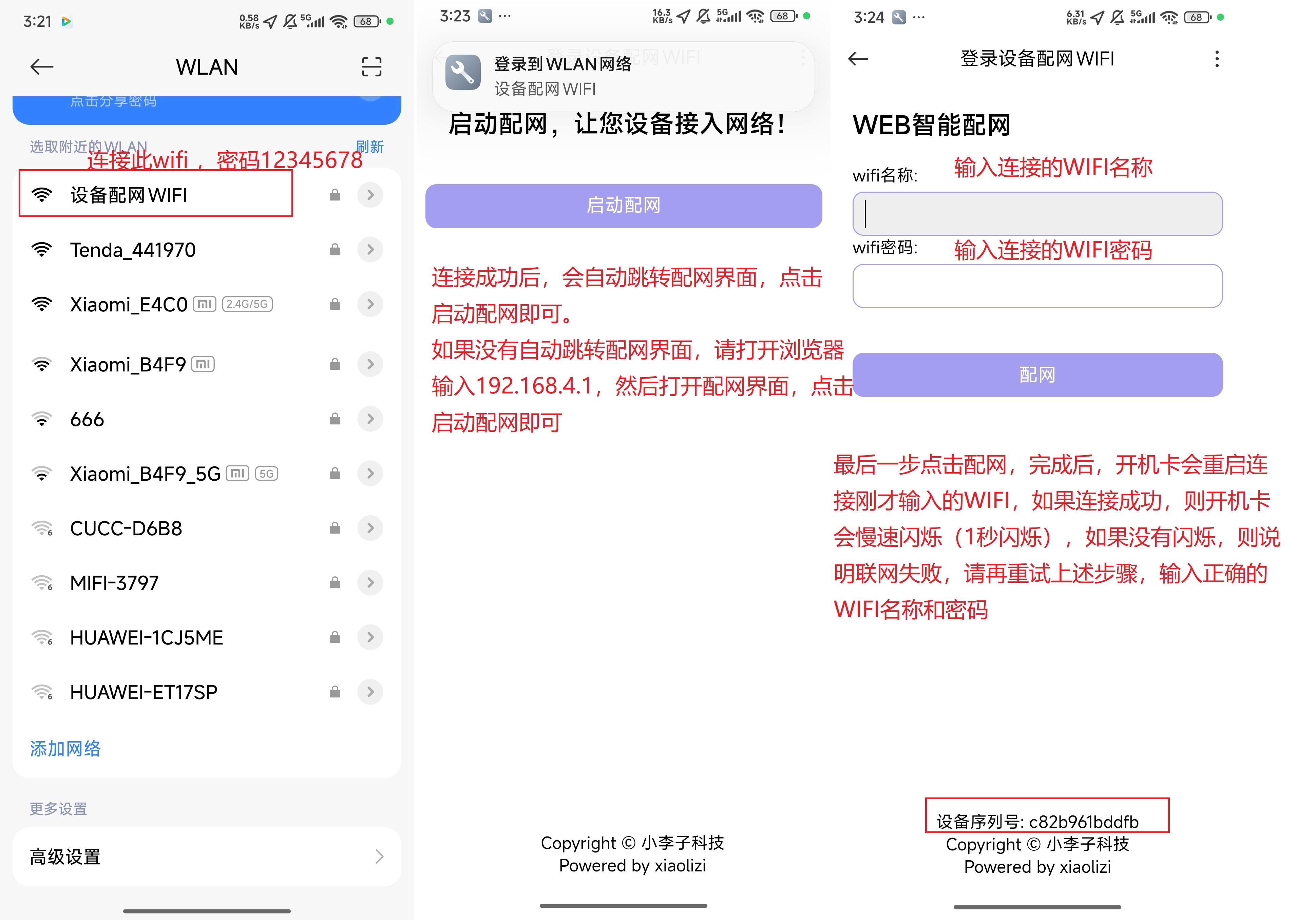 的wifi,输入密码为:12345678,连接成功后,会自动弹出网页进行配网,输入想要连接的WIFI名称和密码,点击配网(点击配网之前请把设备序列号复制出来,用于添加设备的时候输入设备序列号),操作步骤如下图。